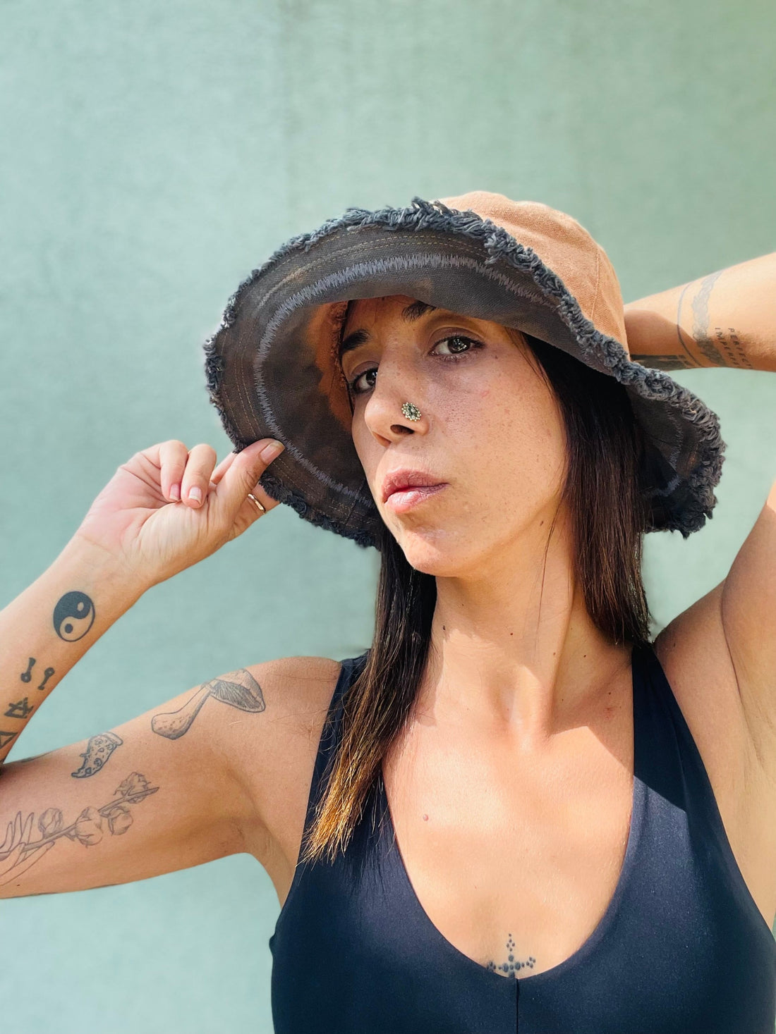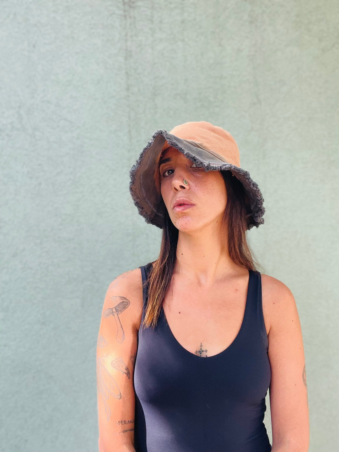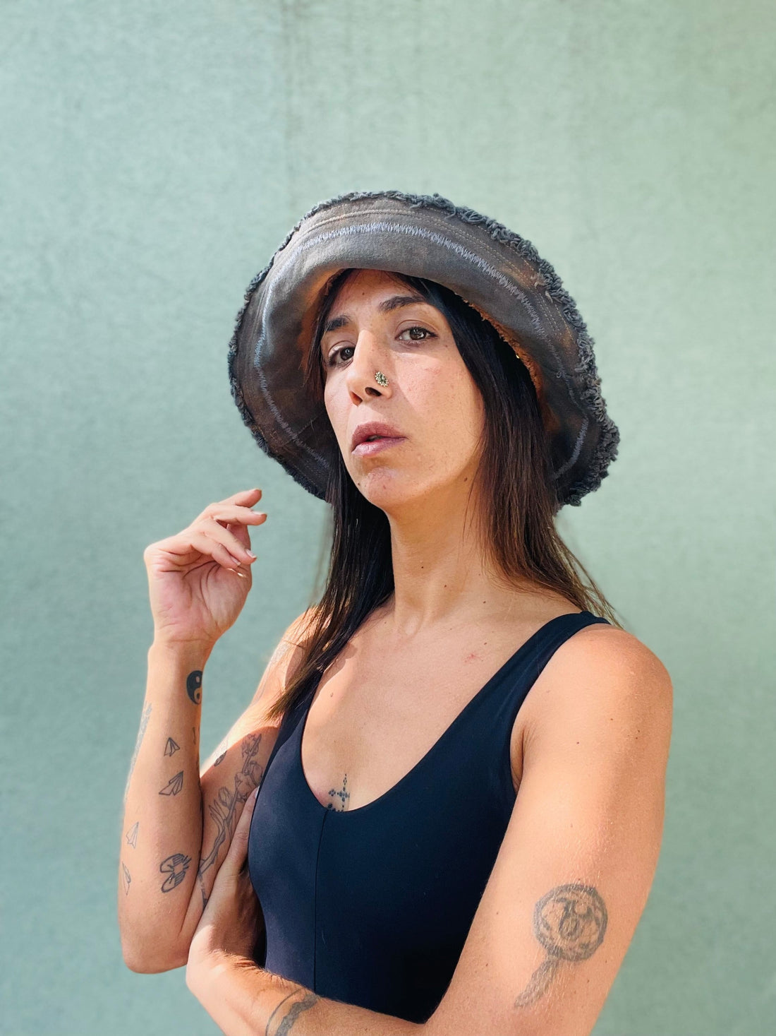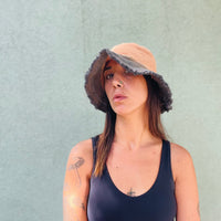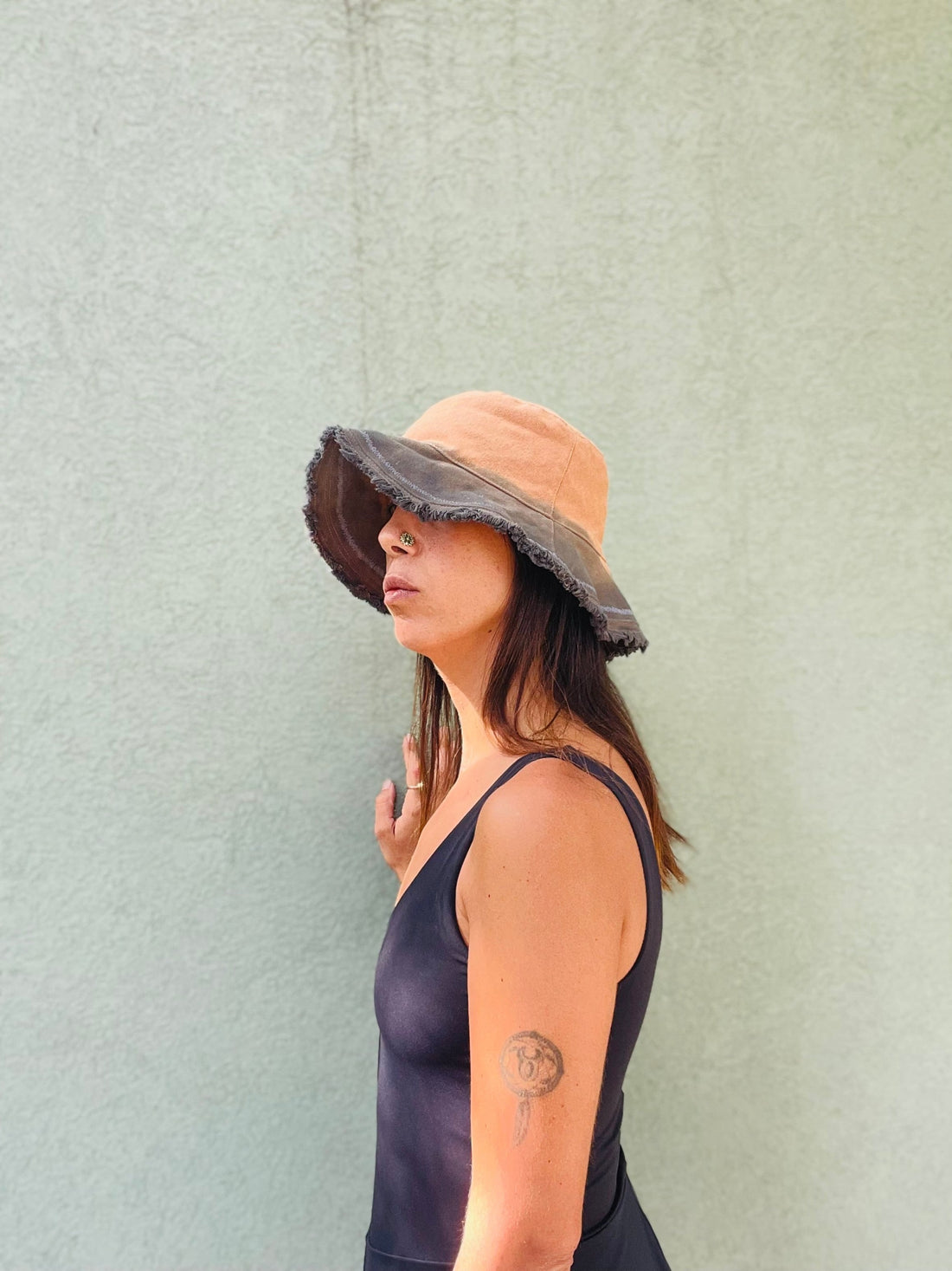 כובע קייצי בגוונים אוקר ואפור מעוצב עם רקמות עדינות